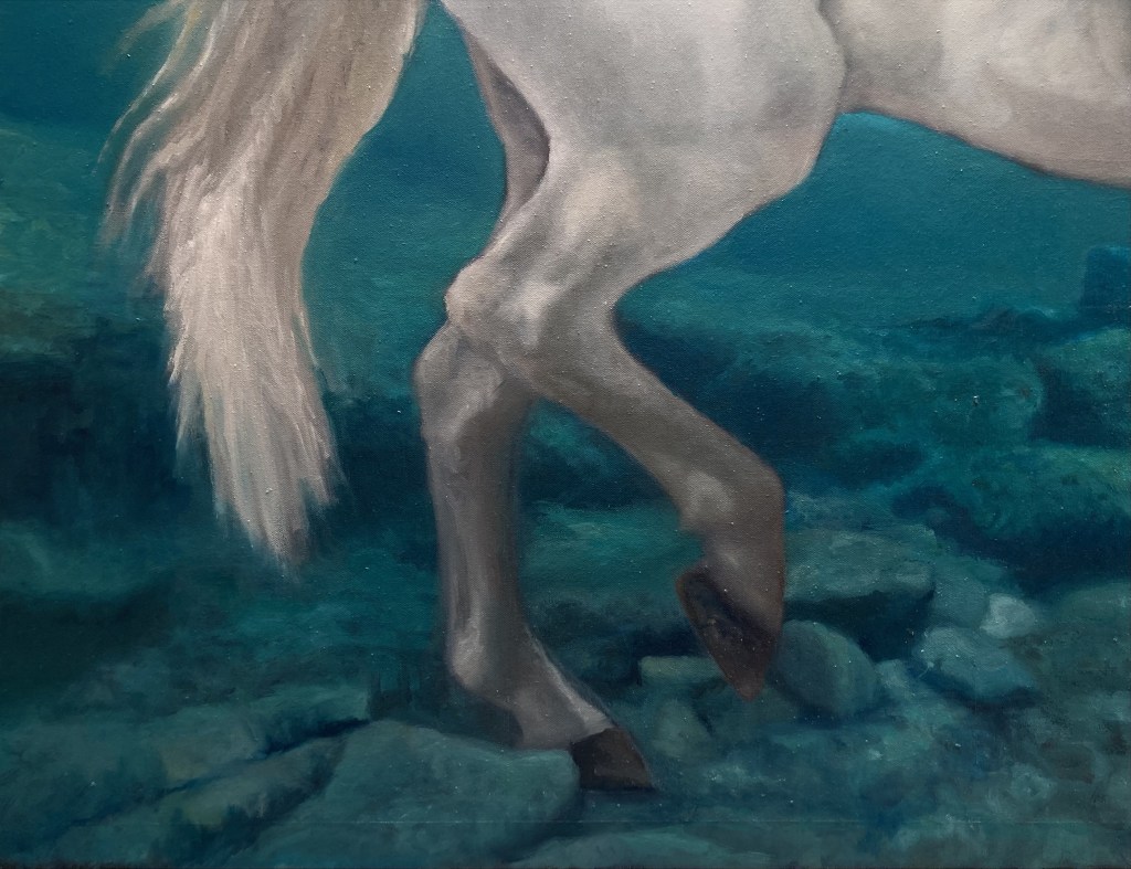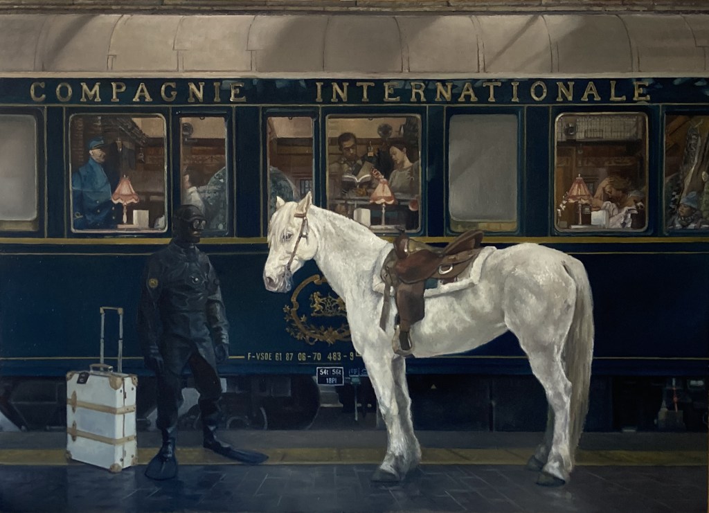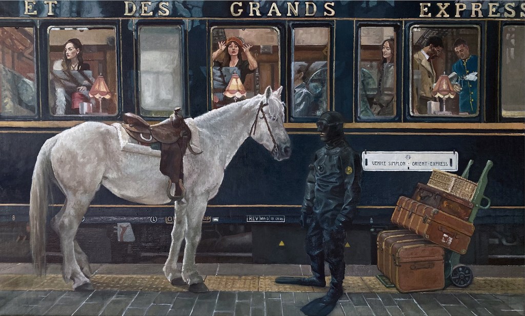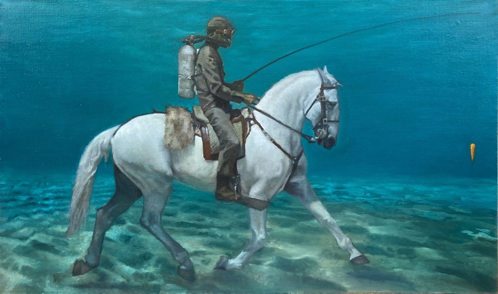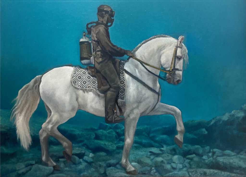 “Il cavaliere sommerso”, olio su tela 94×158 cm, 2025; *collezione privata