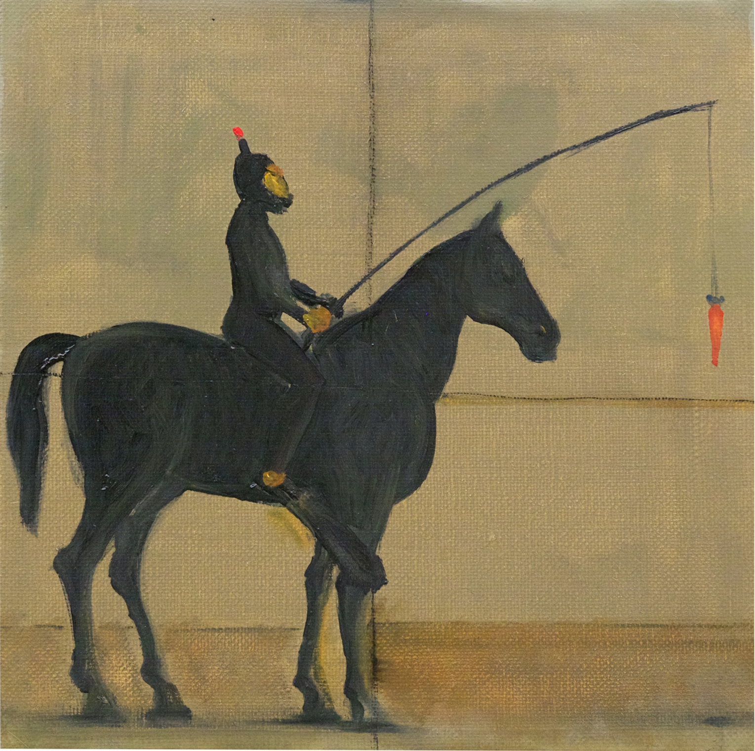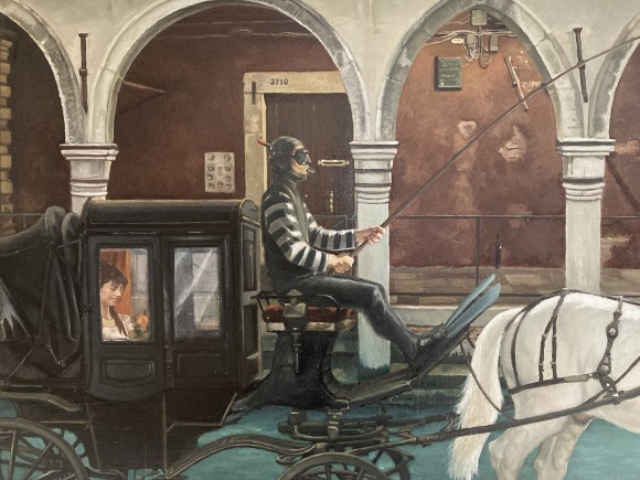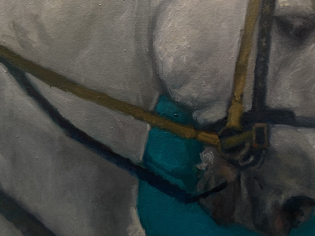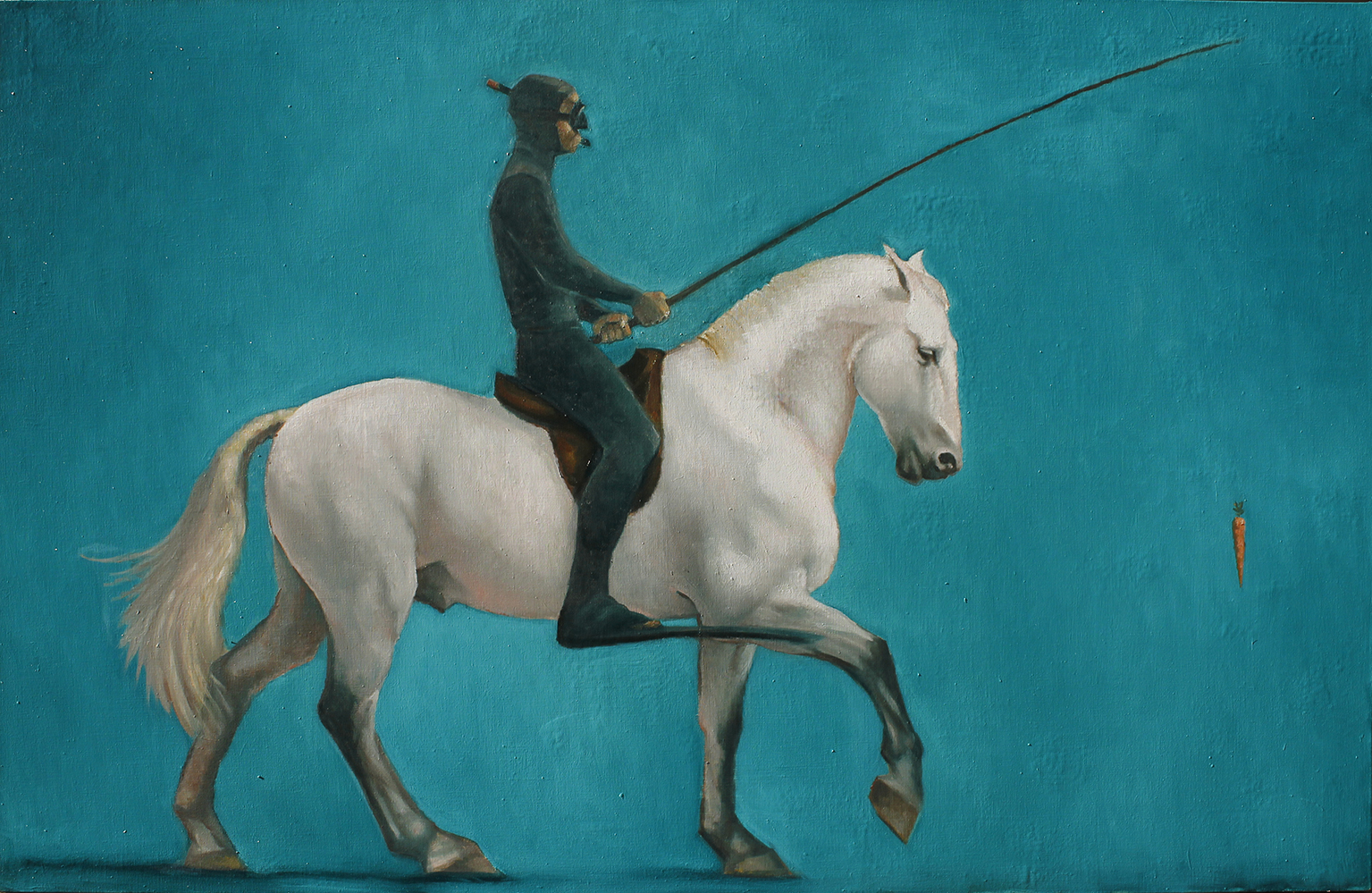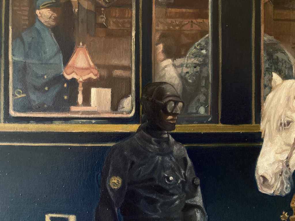 “Il cavaliere sommerso”, olio su tela 94×158 cm, 2025; *collezione privata