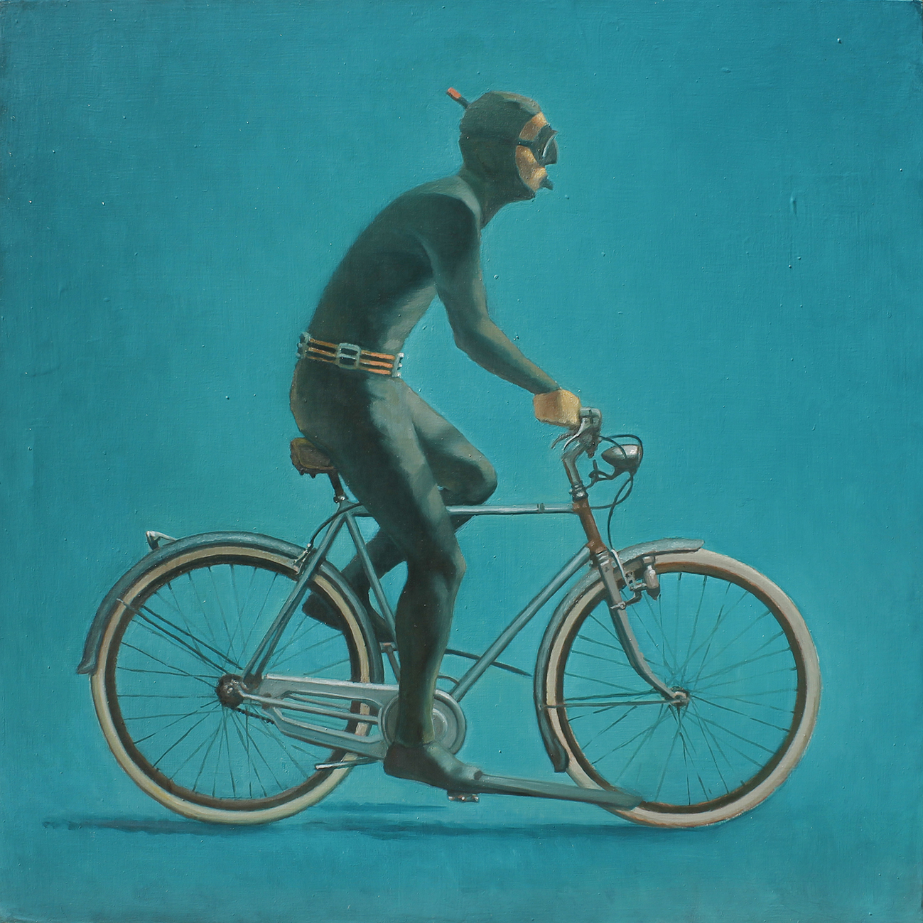 “La piscina del sub”, olio su tela 100×150 cm, 2021; *collezione privata. “Sub in bicicletta”, olio su tela 100×100 cm, 2021; *collezione privata.